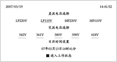 进入欢迎使用充电机特性测试仪,进入汉化开机设置界面。如图六开机设置界面所示。 ■直流电压选择:LF 220V表示低频式的直流电源电压等级为220V(不是高频开关电源的直流电源);LF110 V表示低频式的直流电源电压等级为110V 图六 开机设置界面 (不是高频开关电源的直流电源);HF220V表示高频开关原理的直流电源电压等级为220V(高频开关电源的直流电源);HF110V表示高频开关原理的直流电源电压等级为110V(高频开关电源的直流电源)。 ■交流电压选择:分五种电压分别为380V的90%,95%,100%,105%,110%电压。如果对五种电压中的一种不选择就不做该电压状态的测试。如果选择342V,380V,418v测试过程中就只对这三种电压进行调节测试。361V和398V这两种电压就不进行测试。 ■日历时间设置:如果仪器时间不对就可以对时间进行调节设置。