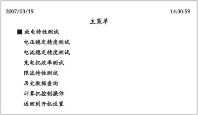 ■进人工作状态:设置完了以上的数据, 确定直流电源电压和试验电压后进人工作状 态,仪器进入主菜单界面。 5.1主莱单 主菜单有放电测试、电压稳定精度测试、电流稳定精度测试、充电机效率测试、限流特性测试、 图七 主菜单界面