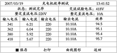 将按开始进入测试过程。如表六界面所示。该试验三相调压装置的起始试验电压既是当时开机设置时选择的电压值,每步试验为时间30s。 完成某项试验时装置同时将试验结果填入该表格中,不合格的充电机效率值, 表六 充电机效率测试界面