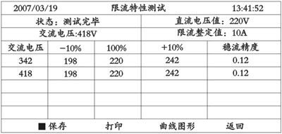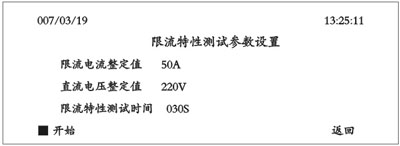 被测试的直流电源系统电压在充电电压调节范围内变化 的输出值。缺省值为220V,范围在180V~260V,缺省值为110V,范围在80V至140V。 ■限流特性测试时间:一般默认为30秒,